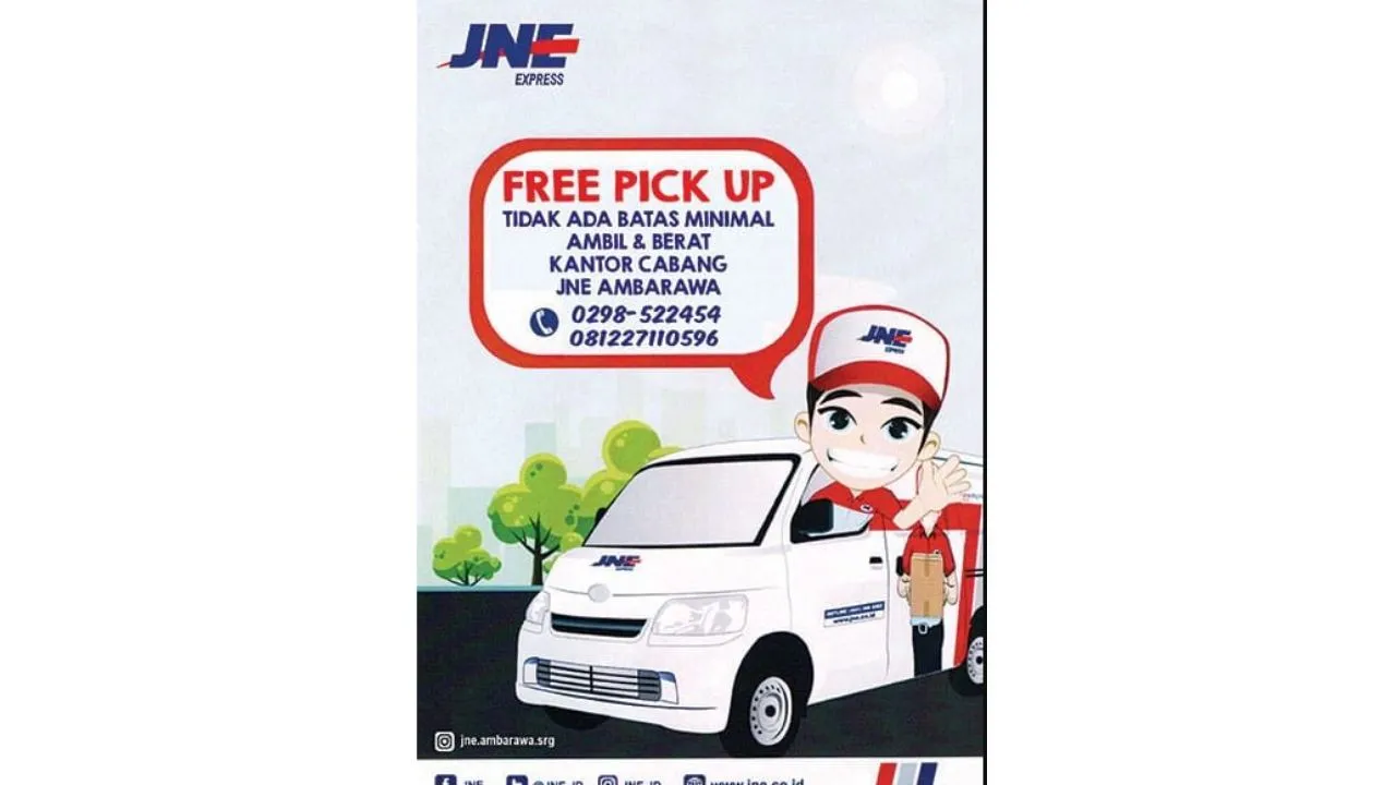 Iklan ini menawarkan layanan "free pick up" tanpa batas minimal berat atau jumlah paket. Gambar utama menampilkan petugas JNE dengan mobil pengantaran.